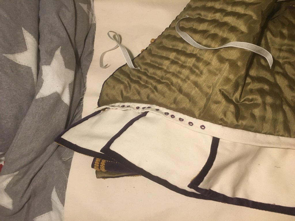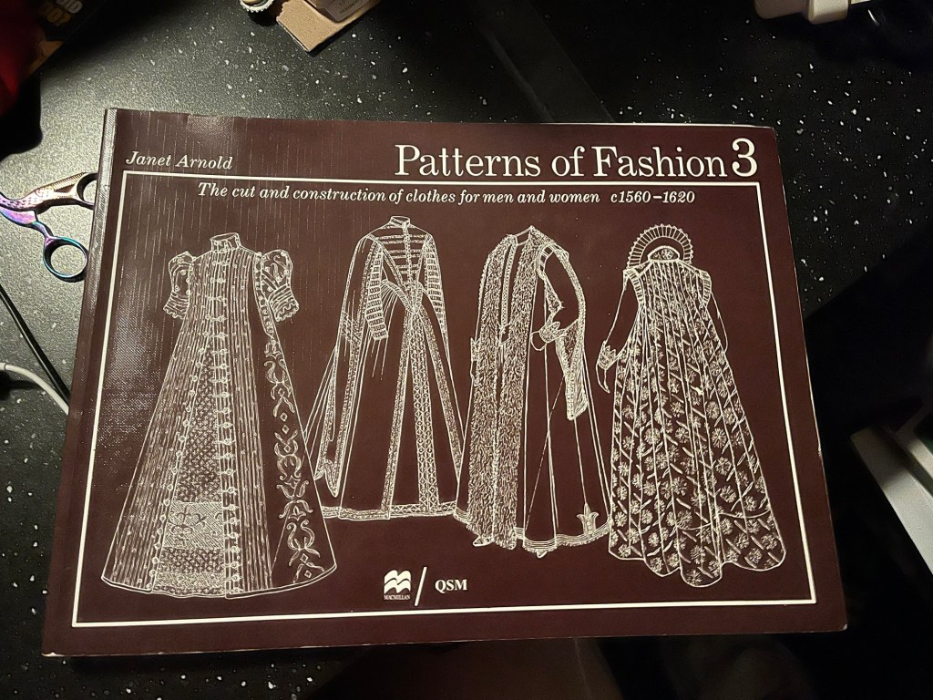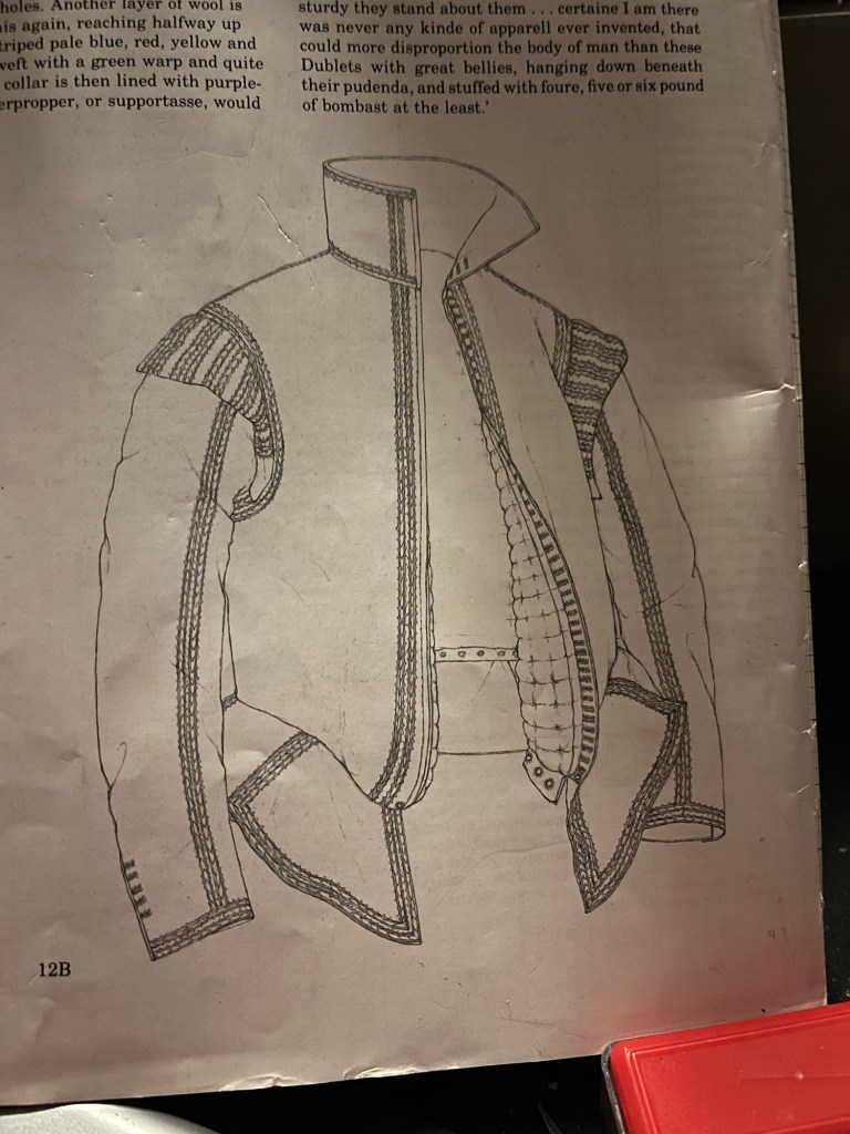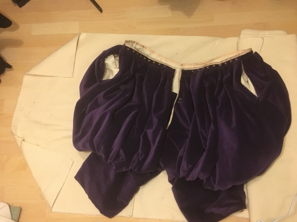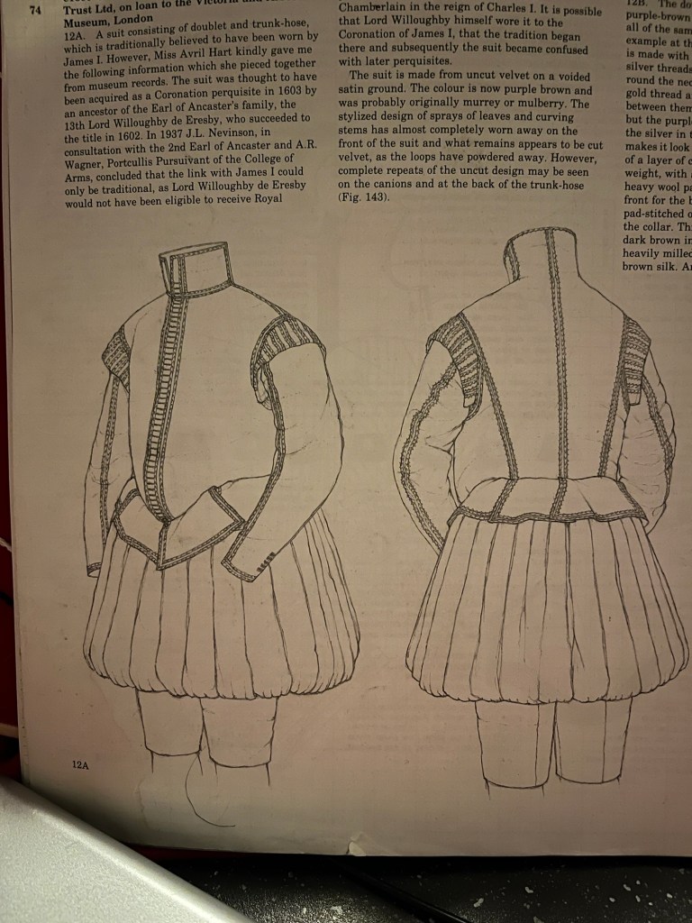 My final piece was different to my classmates as they had to do three costumes and I did one. The reason for this was because mine was an historical reconstruction that was 100% hand sewn. The costume was from Janet Arnold’s Patterns of Fashion 3. The original is said to have been from 1600-05. I believe it was from before that as the style was going out of fashion. In the book it says the possible wearer was 13th Lord Peregrine Bertie, Willoughby de Eresby and he wore it to the Coronation of James 1. Lord Bertie died in 1601. I think the suit was from a few decades before as he did travel extensively and through my research I did find that he was in a part of Italy known for its silk velvet. I found this out through diving through the records of British History Online. https://www.british-history.ac.uk/.